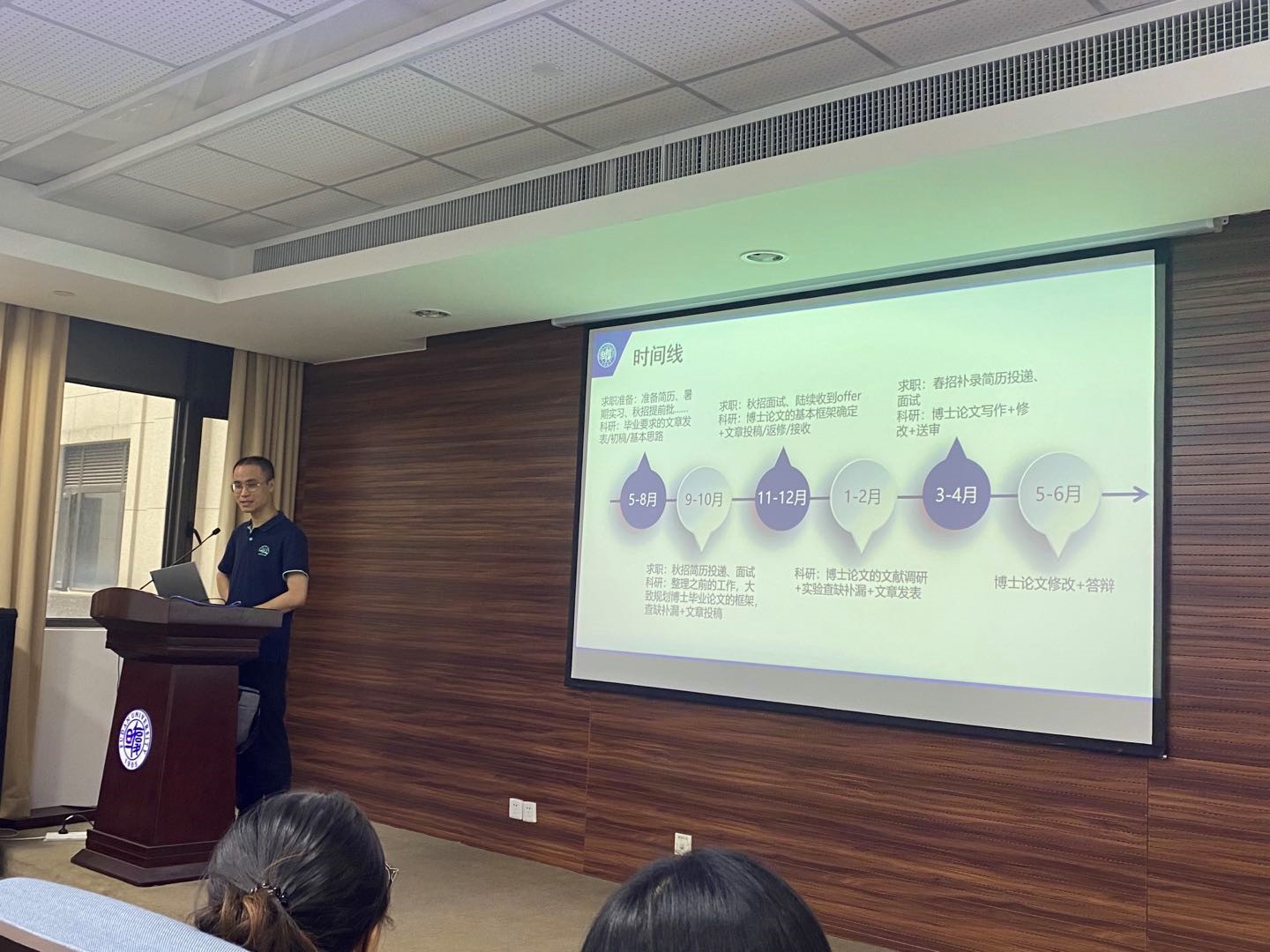 第三位进行经验分享的同学是杨于驰,他从如何平衡博士毕业生期间的科研和工作以及博士生求职两个方面进行经验分享。他鼓励同学们在攻读学位早期多做实验、积累数据、讨论研究想法、争取早日发表论以减轻科研压力,平时要多与导师沟通,尤其是要及时交流自己的未来计划。他还就简历制作进行了经验分享,提倡投递简历时根据不同岗位需求,应该准备多份侧重点不同的简历。在就业选择方面,他建议同学们根据自身情况,选择适合自己的企业或行业、就业地点、薪酬和工作强度,最后,他还梳理了群面、技术面、HR单面的重点,并建议同学们早做准备,不打无准备之仗。