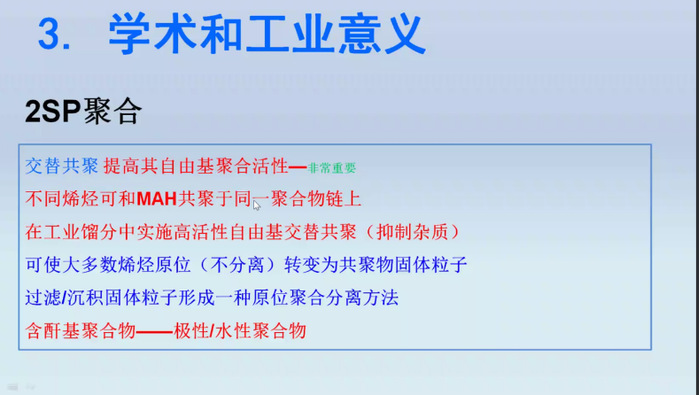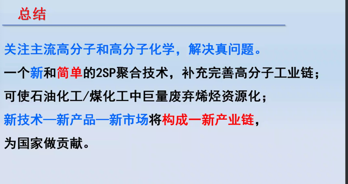 在报告的第三部分,杨老师阐述了该聚合技术的学术和工业意义。2SP聚合技术补充完整了高分子工业链,可使石油化工/煤化工中巨量废弃烯烃资源化。这样的“新技术-新产品-新市场”将构成一个全新的产业链,最终为国家做出贡献。最后,杨教授呼吁科研工作者关注主流高分子和高分子化学,以解决真问题。