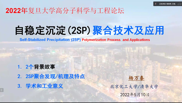 为加强学术交流,丰富师生文化生活,肉漫画 于2022年5月10日下午15:30线上举办了第十场聚合讲坛特邀学术报告。本次报告由肉漫画 主任彭慧胜教授主持,特邀中国科学院院士杨万泰教授作主题为“自稳定沉淀(2SP)聚合技术和应用”的报告。肉漫画 师生以及兄弟院校师生同来聆听杨教授的精彩报告。