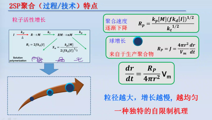 报告的第二部分,杨教授围绕2SP聚合发现、机理及特点展开。针对传统聚合方法和催化剂带来的O、N毒化难以合成极性共聚物以及混合烯烃未得到有效利用这两个问题,杨教授团队自2002年一次偶然的发现开始,经过近二十年的系统研究,开发了一种新型非均相聚合方法——“自稳定沉淀聚合”技术,这是对“主流高分子化学”这个问题的积极响应。与传统乳液/悬浮/分散聚合不同,该聚合体系不使用任何稳定剂,通过静态聚合及自成核-表面沉积增长过程,形成由粒径均匀的聚合物粒子和分散介质构成的稳定胶体;经简单的自沉降、过滤或离心分离,即可得到纯净的聚合物产品。