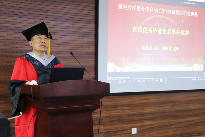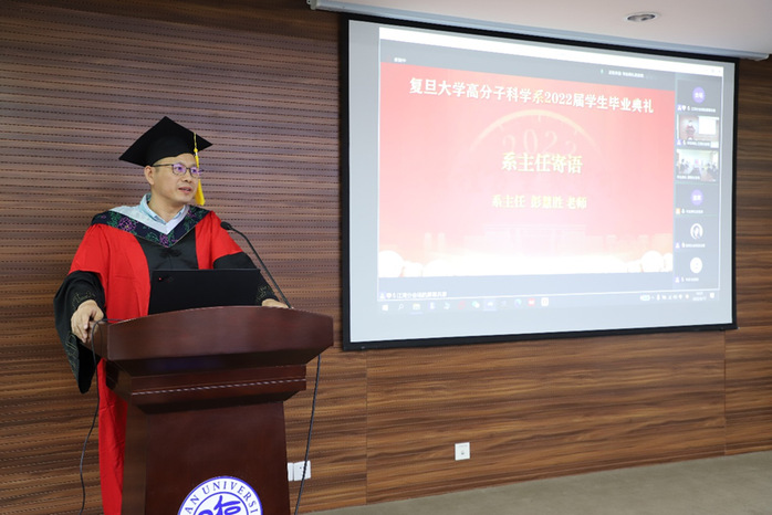 副系主任杨武利老师、冯嘉春老师宣读了2022届毕业生名单。路晨昊、时家悦、臧雨茗分别作为博士、硕士和本科毕业生代表分别发言。路晨昊刚刚荣获肉漫画 第十三届研究生“学术之星”特等奖,他分享了在校学习与科研的努力与收获,并表示会始终铭记“要做顶尖的科研”的教诲,继续砥砺前行,在高分子领域开创新的未来。时家悦感谢导师的教导和学生工作给她带来的成长,希望能够将个人理想融入国家和民族的事业中,带着初心和梦想勇往直前。臧雨茗回顾了在高分子系的成长和蜕变。高分子系就像是一个条件适宜的反应釜,能够给予学生充分反应的良好环境,让同学们实现了从孤立分散、懵懂无知到凝心聚力、奔赴山海的聚变。