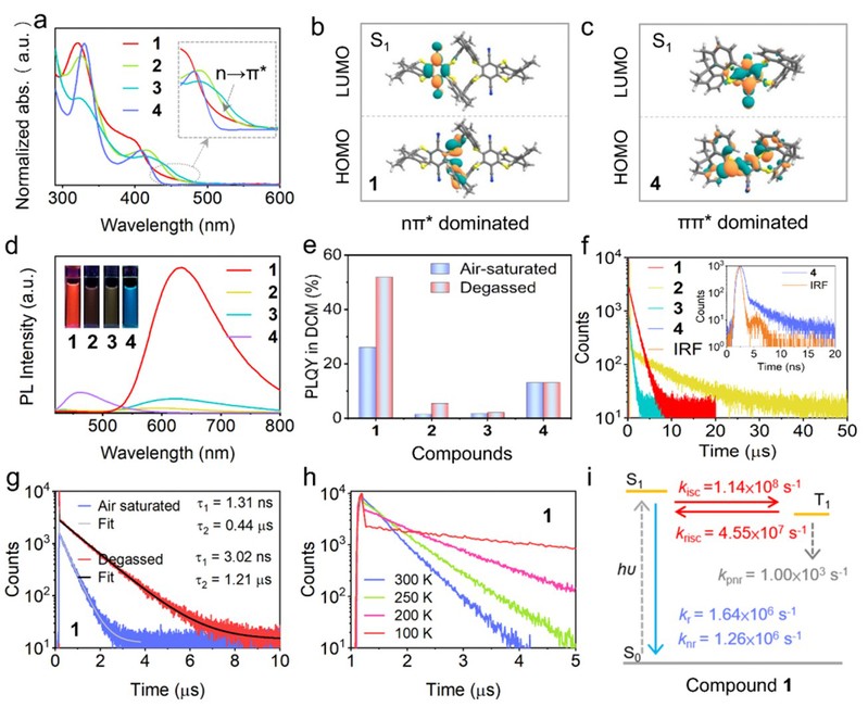 在本项研究中,肉漫画 朱亮亮教授联合台湾大学周必泰教授等提出一种假设:利用π→n发射路径,而非传统基于π→π跃迁的机制,作为实现热激活延迟荧光(即 TADF)的主要辐射路径,或许能够为解决上述问题提供全新的研究视角。就目前所掌握的情况而言,仅有三篇概念性报道((Chem. Phys. Lett. 599, 12-14 (2014);Spectrochim. Acta A Mol. Biomol. 59, 61-68 (2003);J. Lumin. 132, 236-239 (2012))涉及 TADF。然而,这些报道中的发射波长远离红光区域,光致发光量子产率极低,几乎可以忽略不计,更难以谈及开发实际应用的OLED器件。这一研究障碍主要源于这些分子系统依赖于氧和氮的孤对电子,其非键轨道的能量通常难以超越π轨道的能量水平,致使发射无法达到长波长区域,也无法确立 TADF在其中的主导地位。