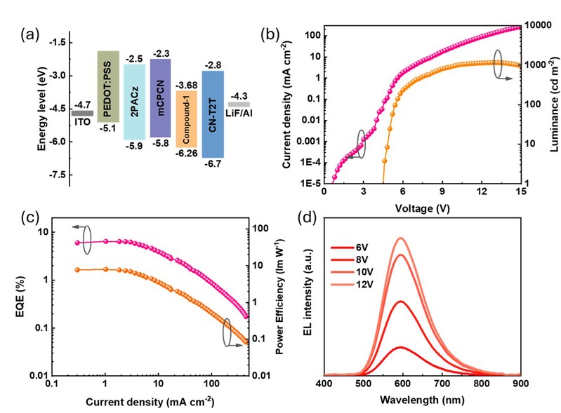 在本项工作中,作者创新性地将硫的孤对电子作为研究突破点。这是因为硫具有较低的电离能以及较高的极化率,能够有效降低电子交换能,并增强非键轨道的能量,进而实现高效的长波长TADF发射。除运用硫的孤对电子外,作者还引入了全新的化学设计理念,以协同推进研究进展。首先,多硫芳香螺环结构显著增强了自旋轨道耦合效应,从而提高了系间窜跃和反系间窜跃的速率。其次,通过螺[4.4]壬烷桥接形成的扭曲给体-受体构型,以及空间正交的硫孤对电子和π轨道特征,显著减小了单重态-三重态能隙。最后,利用刚性的螺环框架有效抑制非辐射衰减通道。基于上述设计,目标化合物1展现出最大发射波长为635 nm TADF发射,其在稀溶液中的光致发光量子产率高达52%(此数据代表了已报道的具有发射的化合物中最高的光致发光量子产率以及最长的发射波长,相关文献比较见图1c)。在结合实验与理论计算数据充分验证其 TADF发射机理之后,作者以目标化合物1为发光层,采用溶液加工法成功制备了基于 TADF机理的OLED器件,其在亮度为189 cd/m2 时,实现了6.4%的最大外量子效率(图2和图3)。