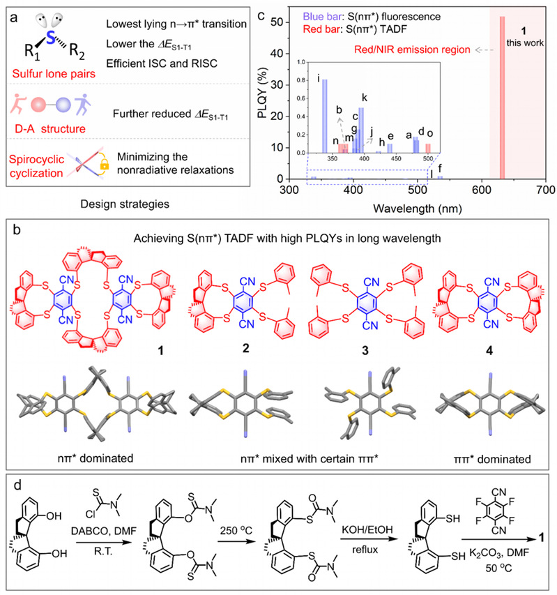 然而,从分子轨道的角度来看,几乎所有已开发的高效有机发光分子(包括荧光、磷光和TADF发光体)都是以具有电荷转移特性的π*→π辐射跃迁作为主要辐射通道。尽管这种类型的跃迁在许多研究中效率很高,但当发光接近红光波段时,能隙定律不可避免地会对其发光效率造成严重影响,这意味着对于给定的分子,其发射波长越长,发光量子产率会显著降低。这种早在1970年便由EnglmanJortner首次提出的矛盾观点,无疑给红光或更长波长的OLED、照明及成像技术的进一步发展带来了挑战。除了能隙定律的限制之外,抑制因结构弛豫引发的其他非辐射衰减速率,以及提升系间窜跃速率,同样是获得高效红光和近红外TADF分子的关键所在。综上所述,开发全新的非常规光物理路径以克服这些难题,显得尤为迫切。