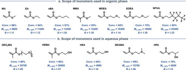 图2. 氧气驱动的ATRP所适用的单体结构及聚合结果。