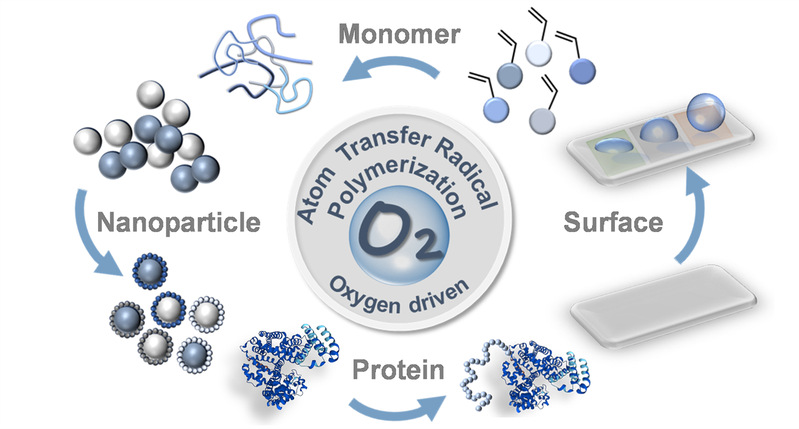 在本文中,该课题组将三乙基硼(Et3B)引入到ATRP体系中,通过Et3B与氧气自氧化反应产生乙基自由基,乙基自由基引发ATRP反应,通过建立“活性种”与“休眠种”之间的动态平衡,实现了在封闭条件(有限氧)和敞口条件(无限氧)下的可控聚合。这种氧气驱动的ATRP,在有机相和水相介质中均实现了高效可控的聚合反应,并获得预定分子量、窄分子量分布以及具有高链末端保真度的聚合产物。同时基于安全性考量,还使用了在空气中能够稳定保存烷基硼胺络合物(Et3B-DMAP),其在使用时可通过适当的热刺激裂解生成具有反应性的Et3B,并引发聚合。同时该团队还结合热裂解和氧气的调控,通过加热和移去热源的方式在有氧条件下控制聚合反应的“开/关”,实现了对聚合物链增长的精准时间控制。此外,该方法被用于蛋白质-聚合物偶联物(Protein–polymer conjugate)的合成,以及纳米粒子和硅片表面的修饰和改性,这些均凸显了其在生物医学以及材料科学等领域的适用性。该氧气驱动ATRP方法的发现,为有氧条件下合成结构明确聚合物提供了新方法,同时也为高分子合成领域提供了一个可工业化精准合成聚合物的新手段。