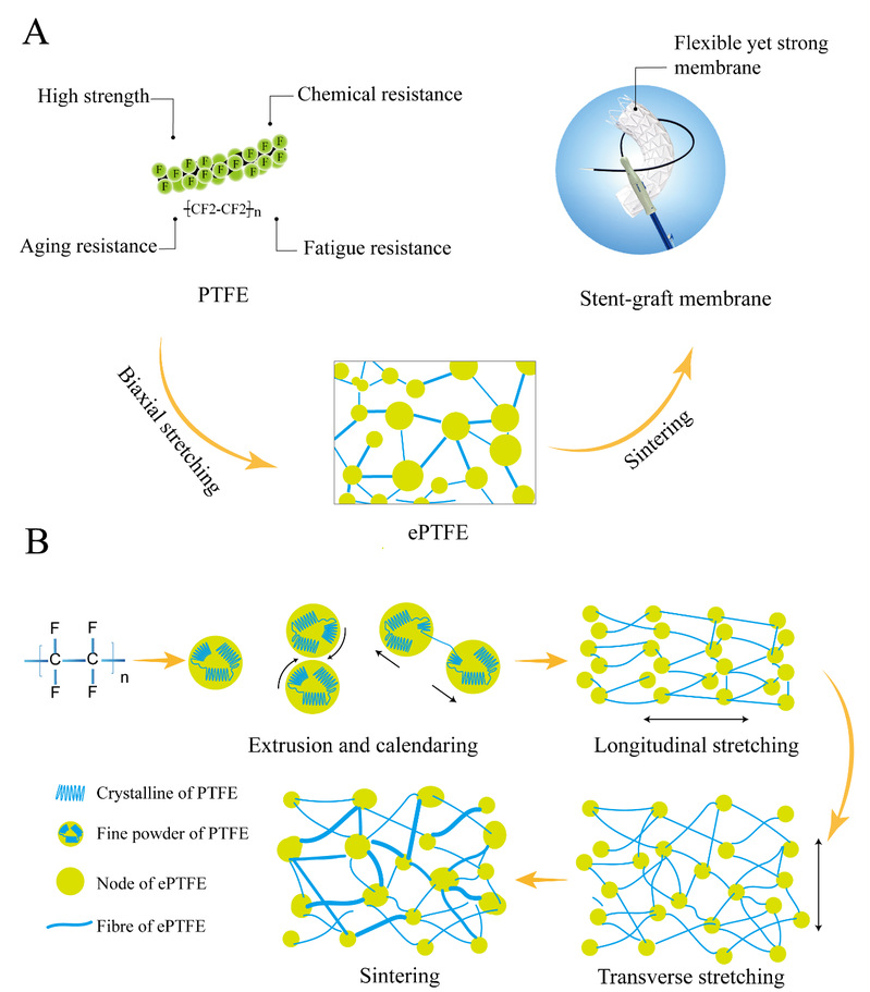 杜邦公司于1938年发明了聚四氟乙烯 (PTFE) 这种高性能的合成聚合物;1969年戈尔公司发明了膨体聚四氟乙烯 (ePTFE),至今已在多个行业被成功应用。鉴于PTFE良好的生物相容性以及ePTFE兼备良好的力学强度和适宜的柔韧性,ePTFE在覆膜支架等医疗器械行业具有独到用途。然而,可工业化生产的医用级高性能ePTFE仅发达国家有少数供应商,中国在此关键的医用原材料领域一直处于空白。