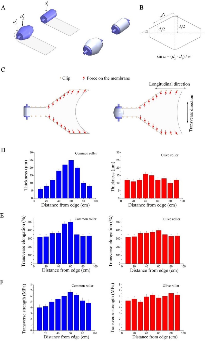 团队还创新设计了特殊的橄榄辊以改善传统工艺。比较使用橄榄辊和普通辊拉伸所制备ePTFE膜的性能可知,使用普通辊进行横向拉伸时所得ePTFE膜厚度不均匀,中间厚、两边薄;而横向拉伸中引入橄榄辊则显著提高了厚度均匀性,降低结构损坏的可能性,延长使用寿命,如图3所示。