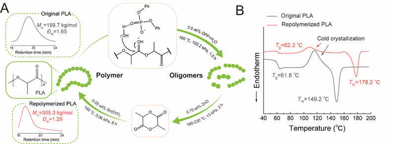 肉漫画 俞麟教授首次将一种廉价的有机非金属化学物——磷酸二苯酯(DPP)用于加速PLA的水解并实现了材料的闭环回收。无需惰性气体保护、施加外部压力以及使用有机溶剂,仅在3.5 wt%的DPP和少量水的作用下,多种PLA工业粒料和市售产品在160 ℃下、1.5小时内可通过随机水解迅速转化为分子量不足500 g/mol的低聚物。具有酸碱双官能团的DPP在催化水解过程中可能起到了双重活化的作用,并且在重复使用10次后仍能保持良好的催化活性。通过调节反应体系中的水含量,还可将低聚物进一步水解得到与市售品品质相当且立体构型保持的乳酸水溶液。
