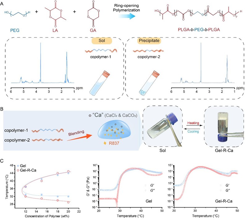 The TPV matrix is initially a polymeric aqueous system composed of PEG/PLGA block copolymers (Figure 2). Considering that the thermogellable composition window for a one-component copolymer is very narrow, Ding’s group put forward a “block blend” strategy. One of the amphiphilic copolymers is relatively hydrophilic (copolymer-1), the other is relatively hydrophobic (copolymer-2). Each of them cannot exhibit sol-gel transition in water with temperature changing, but the appropriate blends can; the sol-gel transition temperature can be well tuned as well. The TPV physically gels at body temperature.