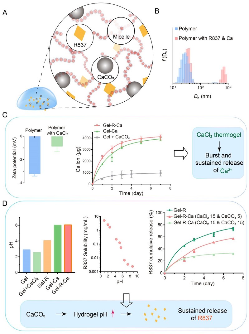 The TPV-gel was encapsulated with both calcium-containing inorganic salts (CaCl2 and CaCO3) and the R837 immunoadjuvant (Figure 3). The TPV-gel could achieve a therapeutic effect by providing sufficient calcium ions in residue tumor site and induce immunogenic cell death of residue tumor cells via calcium overload. Appropriate release profiles were achieved after the thermogel was modulated via molecular engineering of polymers.