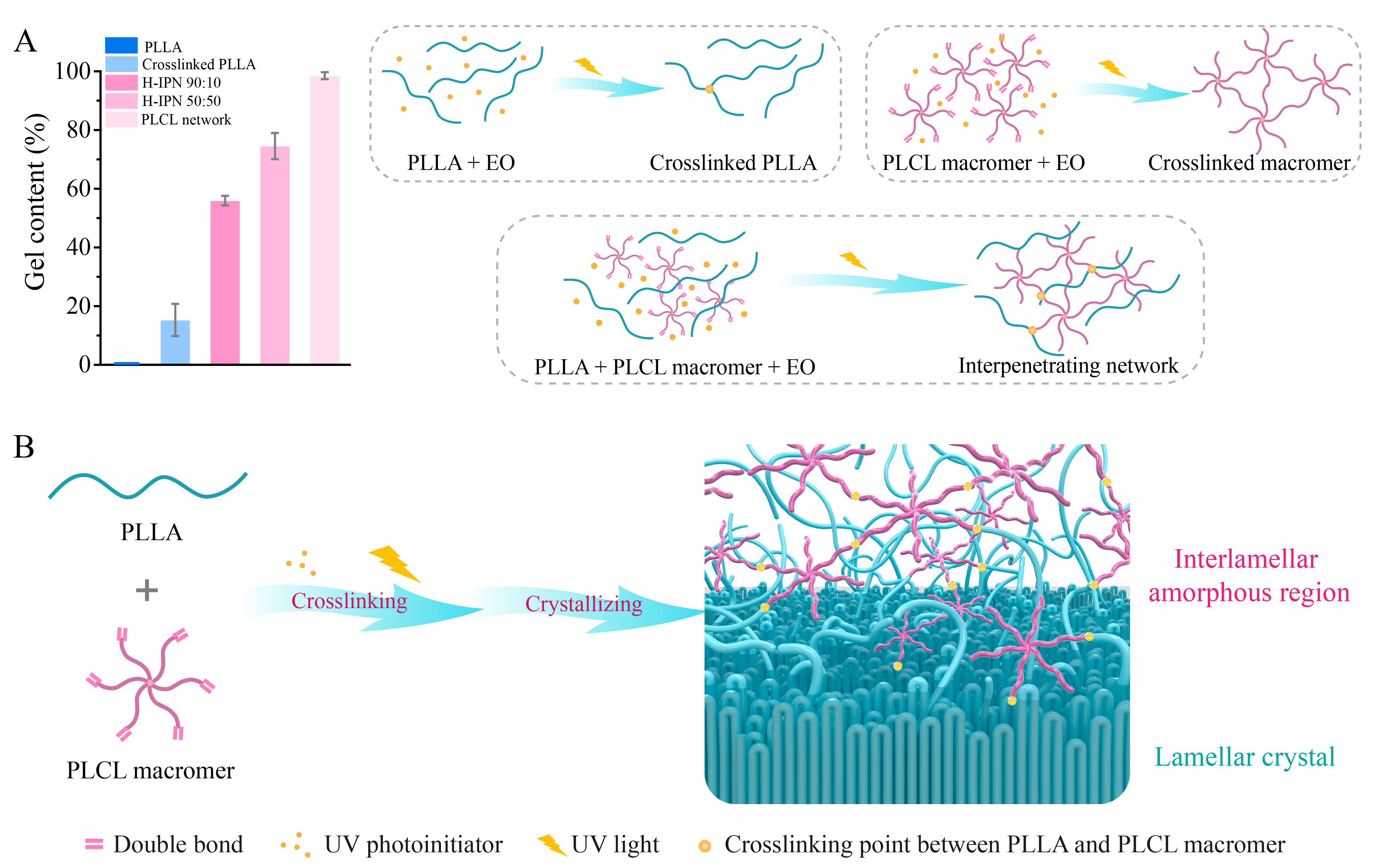 The H-IPN material includes a physical network of spherulites and a chemical crosslinking network, and the chemically crosslinking network in the H-IPN may be distributed in the amorphous region of spherulites, and permeated into the spherulite network. The formation process of the H-IPN material depends on a designed sequence of time and temperature. The formation of the chemically crosslinked networks requires the temperature below the melting temperature Tm of linear PLLA, but above its crystallization temperature Tc. Then, no crystallization occurs at the initial stage, and chain segments of polymers have strong mobility, easy to realize sufficient crosslinking. The photoinitiating was triggered by UV light, and the photoinitiated free radical polymerization and hydrogen abstraction reaction jointly led to the formation of an interpenetrated network between PLCL and PLLA chains (Fig. 2).