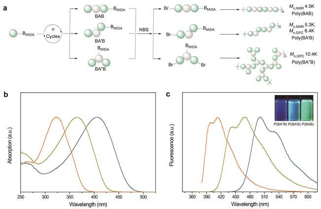 These synthesized regio- and sequence-defined oligomers could undergo iterative exponential growth and polycondensation reactions to fabricate regio- and sequence-controlled topological polymers, such as linear, branched and dendritic polymers. The effects of para- or meta-junction, topology and sequence were also discussed. As shown in Figure 3, the polymers poly(BAB), poly(BA'B) and poly(BA''B) had similar molecular weights and different topologies, which could emit different colors of fluorescence under ultraviolet light. Therefore, the topology had a significant effect on the optical properties of conjugated polymers, and this synthetic method was expected to prepare functional materials with different application fields, such as data storage, organic electronics, etc.