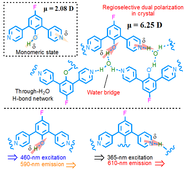 Recently, Zhu’s group developed a series of D-A molecules with both proton donor and acceptor involved were designed. Water molecular bridge was then established in their crystal structures, which firmly and alternately connected with the proton donor of one molecule and the acceptor of the other via intermolecular H-bond network. In this way, selective dual polarization of the phenolic hydroxyl group and the pyridinyl group could be achieved, owing to the strengthening of charge-separation orientation upon the simultaneous deprotonation and protonation tendency of the D-A molecules. This effect led to an up to 3-5 folds amplification of the molecular dipole moments in the crystal form relative to their monomeric state. On this basis, multi-excitation and multi-emission characteristics from these charge-separated crystals were achieved, endowing the ability of visually detecting the energy of light source covering a large-scale UV-Vis spectral region.