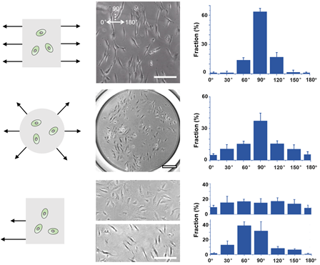 Figure 3. The three stretching modes and their cell experimenting results. The items shown from left to right are the stretching mode, cell states, and statistics of cell orientation. Scales bars: 200 μm.
