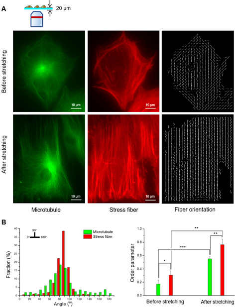 Figure 4. Fluorescence micrographs of cytoskeleton structures and their statistics. (A) Fluorescence micrographs of microtubules (left column) and stress fibers (middle column) before and after uniaxial stretching, and the fiber orientation marked by computer programs developed by the authors. (B) The left figure shows the orientation statistics of microtubule and stress fiber after uniaxial stretching. The right figure shows the order parameters of the cytoskeleton before and after uniaxial stretching. Marked in the figure are significant differences with “*” (p < 0.05), “**” (p < 0.01) and “***” (p < 0.001)