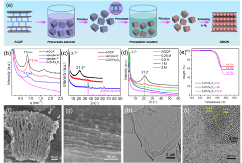 AGOF provides a platform to synthesize diverse graphene-based heterostructures due to its highly accessible interlayer space. The extended chain con-formation and hydrophilic nature of PEA allow a variety of metal ions to diffuse into the interlayer space and then transform to layered metal hydroxides or oxides. Employing AGOF and in-situ precipitation re-action, we synthesized several graphene-based, alter-nately aligned metal oxide heterostructures, including ZnFe2O4, TiO2, Fe2O3, Mn2O3 and Co3O4. The corresponding process is illustrated in Figure 2a. To control the precipitation reaction only to occur within the interlayer space, the salt solution outside AGOF was removed through filtration after the metal salt sufficiently diffusing into the interlayer. The subsequent precipitation reactions and the chelating effect of ether bonds (of PEA) to metal ions enable the fast formation of layered metal hydroxides within AGOF. Taking the study of AGOF/ZnFe2O4 heterostructure (G/ZnFe2O4) as an example, the structural evolution of graphene-based heterostructure during synthesis was analyzed (Figure 2b-e). The obtained G/ZnFe2O4 heterostructure maintained the organ-like skeleton morphology well (Figure 2f and g) and showed good structural stability. This is mainly due to the interlaminar bridging PEA molecular chain, which also promotes the uniform distribution of metal salt ions to form regular, smooth surface ZnFe2O4 nanometer tablets (Figure 2h-j).