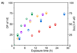 the polymer obtained by this method has controlled molecular weight, narrow molecular weight distribution, high chain-end fidelity and first order kinetics for reactions of different VEs. DPs of both CTFE and VEs are very close to each other throughout the copolymerization processes, confirming the alternating chemical structures of the copolymer backbones (Figure 2). Fluorinated photocatalysts and initiators plays an important role in the process of condition optimization.
