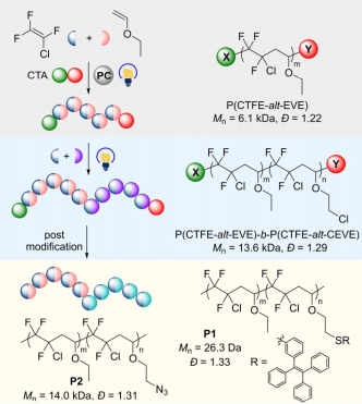 After alternating copolymerization of CTFE and ethyl vinyl ether (EVE), obtained polymer was subsequently employed as a macroinitiator in the chain-extension reaction with CTFE and CEVE under the same photopolymerization conditions without additional photocatalyst. The fluorinated block copolymers with all alternating segments have provided versatile accesses to various fluorinated materials by modifying the chloride group on the side chain. different functionalities could be incorporated, including the azide groups and tetraphenylethylene (TPE). While the tailoring of azide group provides opportunities to further connect with desirable functionalities via the copper catalyzed “click” chemistry (Angew. Chem. Int. Ed. 2001, 40, 2004), the TPE group could embed the corresponding materials with aggregation-induced emission (AIE) behavior (Adv. Mater. 2014, 26, 5429).